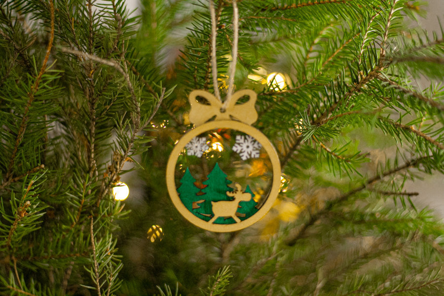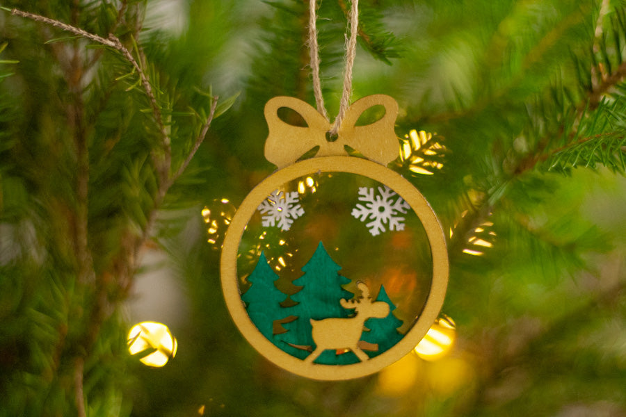 Kerroksellinen puinen joulukoriste, jossa kaiverrettuna pala suomalaista metsänhenkeä porojen ja leijailevien lumihiutaleiden kera.