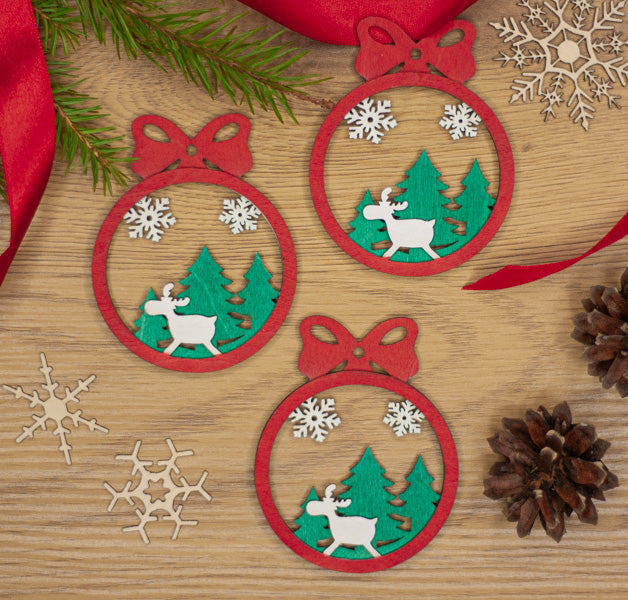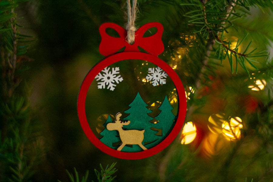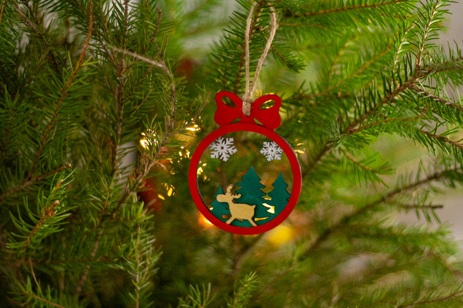 Kerroksellinen puinen joulukoriste, jossa kaiverrettuna pala suomalaista metsänhenkeä porojen ja leijailevien lumihiutaleiden kera.