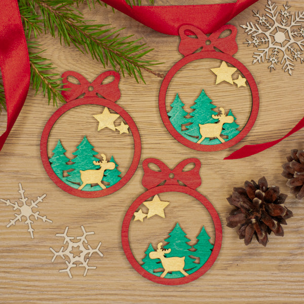 Kerroksellinen puinen joulukoriste, jossa kaiverrettuna pala suomalaista metsänhenkeä porojen ja tähtien kera.