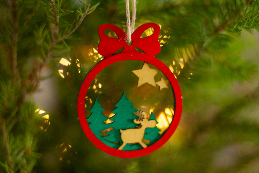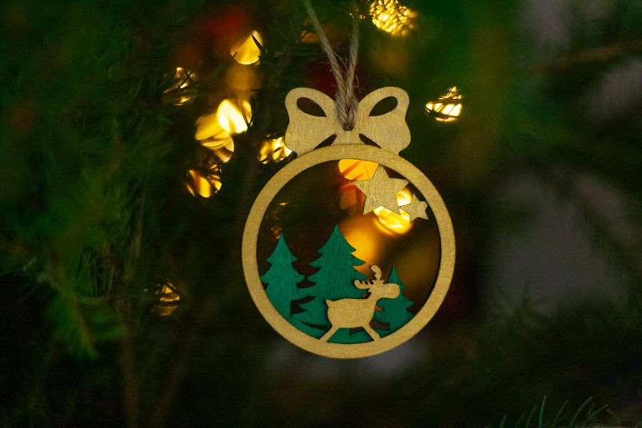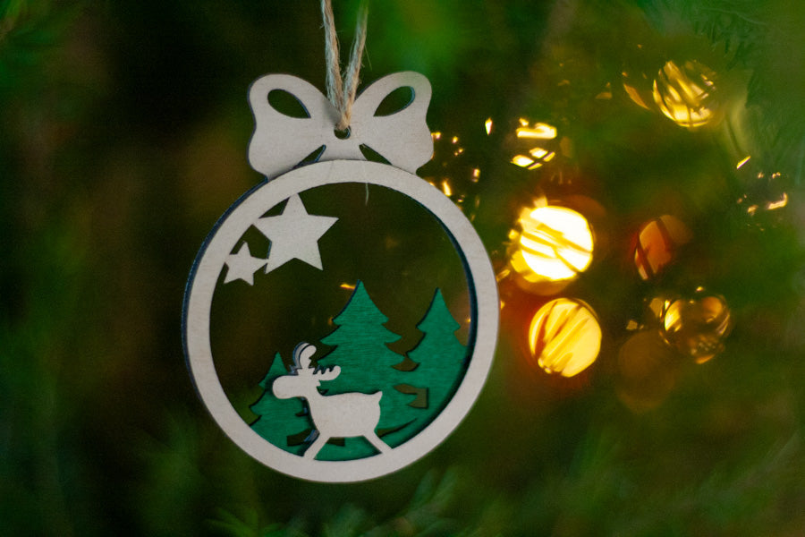 Kerroksellinen puinen joulukoriste, jossa kaiverrettuna pala suomalaista metsänhenkeä porojen ja tähtien kera.
